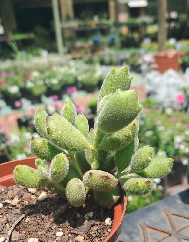Cotyledon ladismithiensis ‘Konekonotume’ is a slow-growing succulent shrublet. The thick, ovate green leaves have fine white hairs and prominent 1 to 3 teeth on the edges, unlike the Cotyledon tomentosa with up to 10. When exposed to full sunlight, the teeth can develop a dark red hue. While more teeth may be present on the leaves initially, they tend to disappear as the leaves mature. The branches are rigid with brown peeling bark.