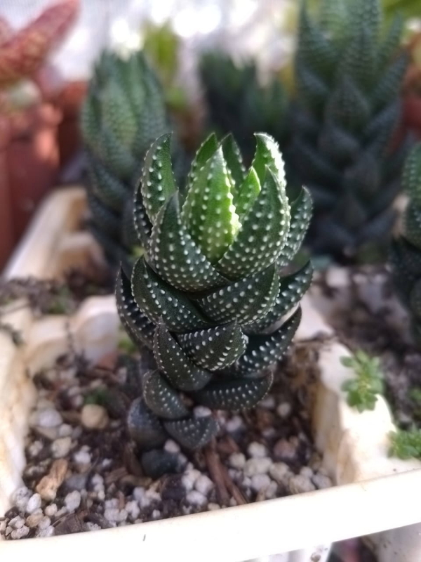 Haworthiopsis coarctata is a clump-forming succulent with stacked, fleshy, dark green leaves covered in rounded white tubercles. The leaves are arranged in a rosette and can turn brownish-red when exposed to full sunlight.