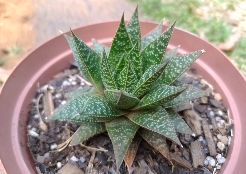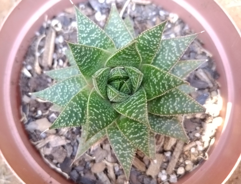 Gasteraloe ‘Flow’ is a hybrid succulent with a rosette of triangular, deep green leaves speckled with white bumps and edged with toothed margins. This plant is an excellent choice for indoor cultivation, making it an ideal houseplant.