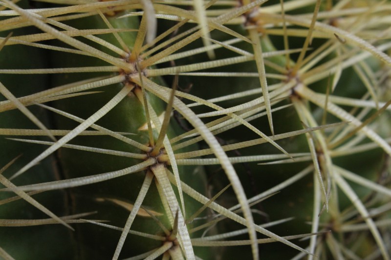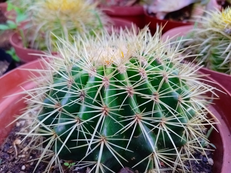 Echinocactus grusonii is a cactus that grows slowly and has a round, typically solitary stem which takes on a barrel-like shape as it matures. Its light green stem is deeply ribbed and adorned with many areoles that produce sharp radial spines ranging from yellow to white.