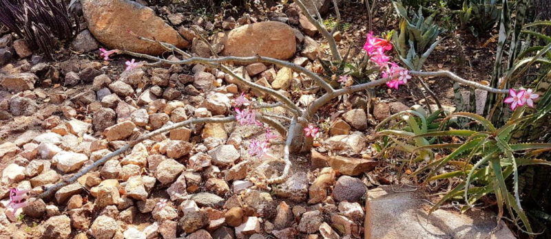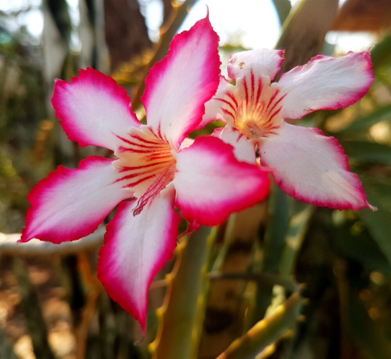Adenium multiflorum is a succulent shrub or small tree with a shape resembling a miniature baobab. The bark is shiny grey to brown. The leaves grow in clusters at the tips of the branches and are shimmering green above and pale below. Before flowering, the plant will shed all its leaves.