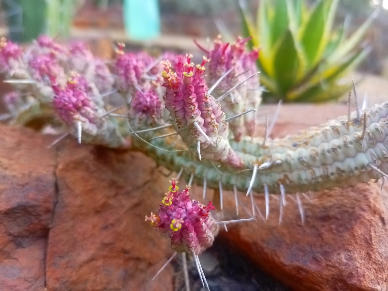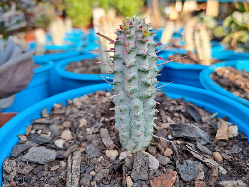 Euphorbia mammillaris ‘Variegata’ is a succulent with white stem and emerald green markings. As it matures, the plant develops long, sharp spines at the top of each stem. Its small, variegated leaves are relatively short-lived. Over time, it grows multiple stems, creating an appealing cluster.