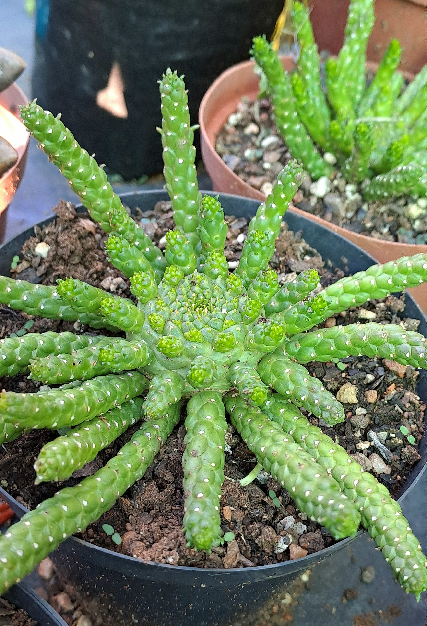 Euphorbia flanaganii is a small succulent plant with a swollen underground stem. Cylindrical, snake-like branches that grow flat on the ground. The leaves of this plant are small, measuring up to 10 mm in length and 1 mm in width, and they have a linear to acute shape.