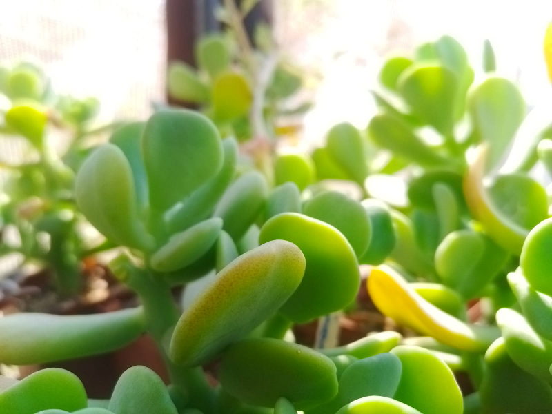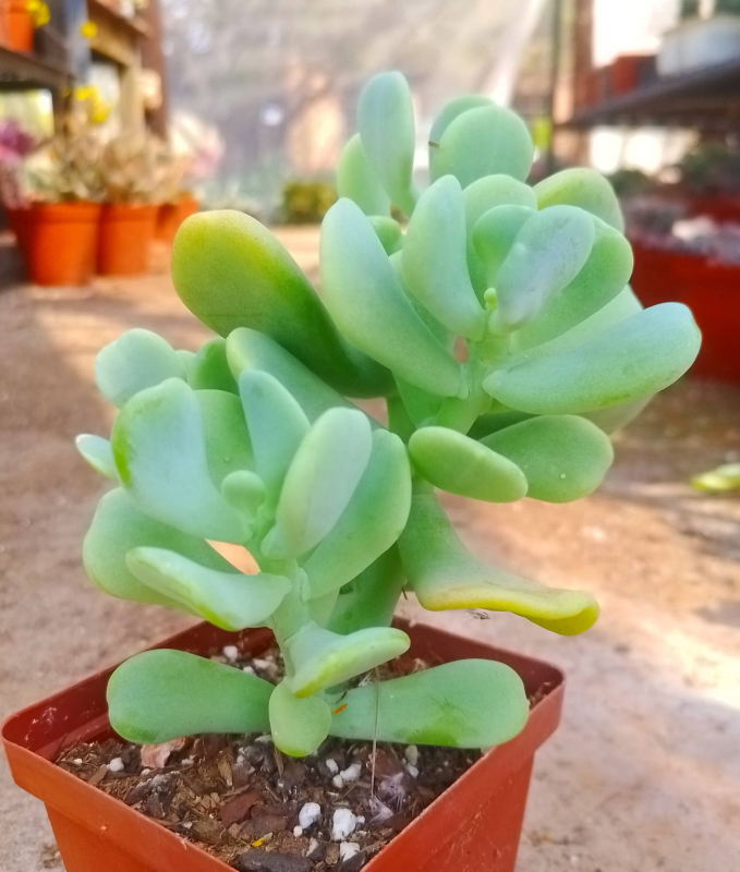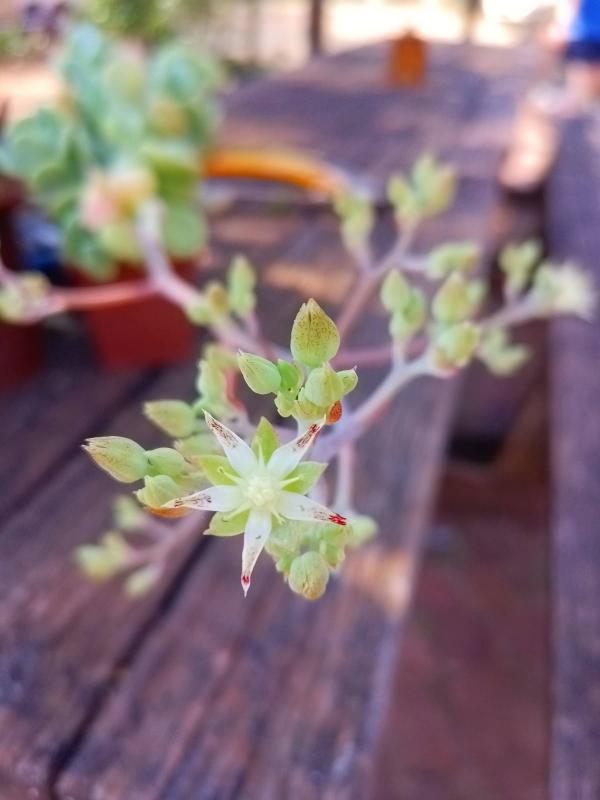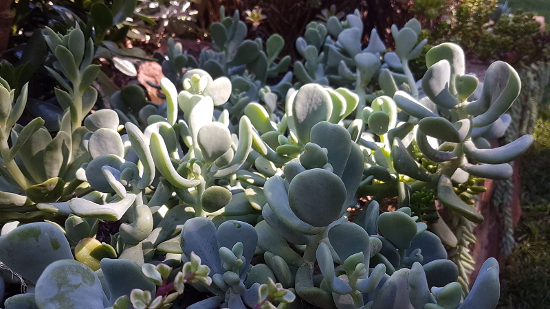 Sedum allantoides ‘Goldii’ is a succulent with flat, spoon-shaped leaves covered with a powdery coating (farina). The leaves display a pastel blue-green to yellow-green colour.
