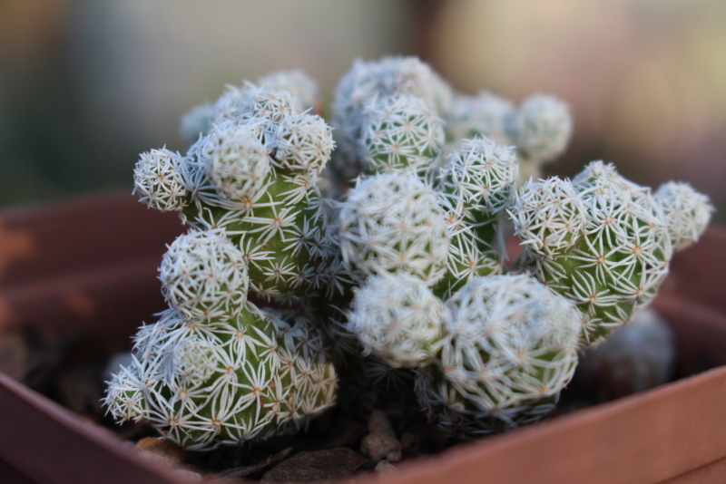 Mammillaria gracilis fragilis is a small cactus with cylindrical offsets that forms a dense clump. Each stem is bright green and covered with white, interwoven spines.