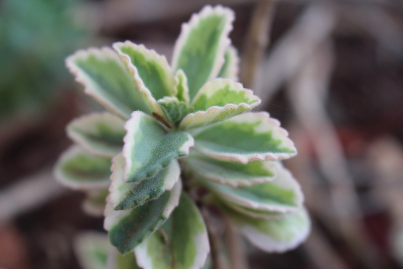 Coleus neochilus ‘Mike’s Fuzzy Wuzzy’ is a succulent plant with bushy growth. It has fleshy, grey-green leaves edged in cream. The leaves are oval-shaped to elliptical with slightly toothed edges. They have fine hairs, are somewhat sticky, and have an unpleasant smell. They can be used in different forms, from low-lying ground covers to medium-sized shrubs.